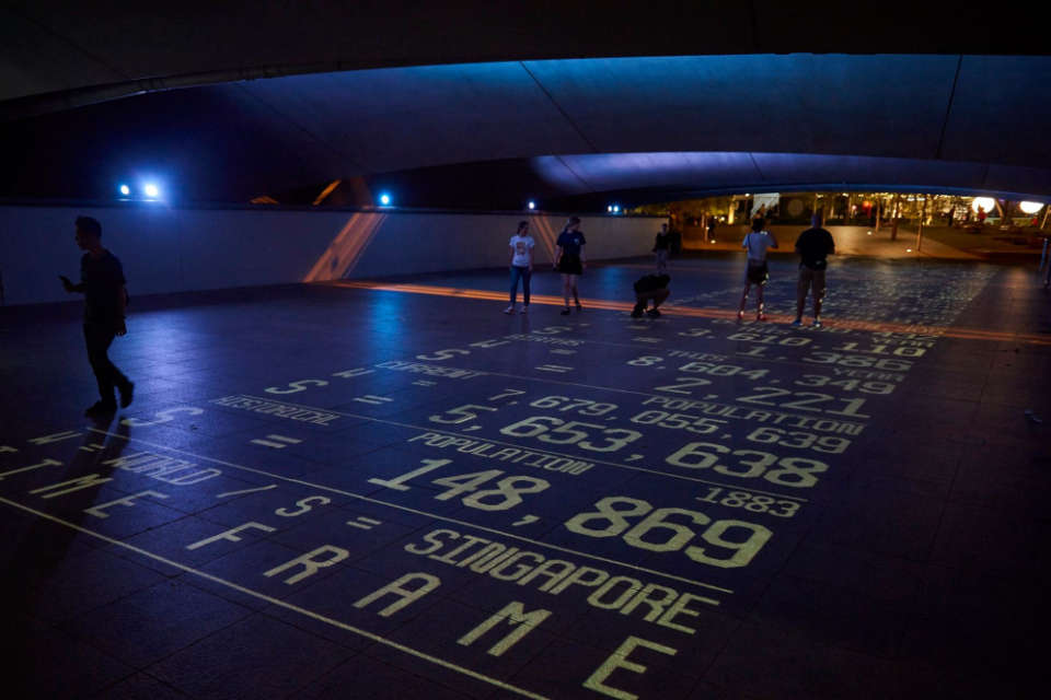 A carpet of information such as population figures, to the number of e-mails sent will be projected in real time to report, celebrate and engender awareness on the development of Singapore over the years in relation to the world.
