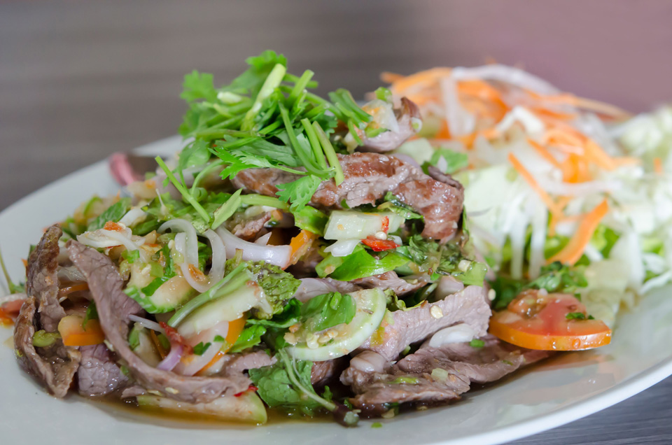- Barbeque the beef and thinly slice it into bite sized pieces.