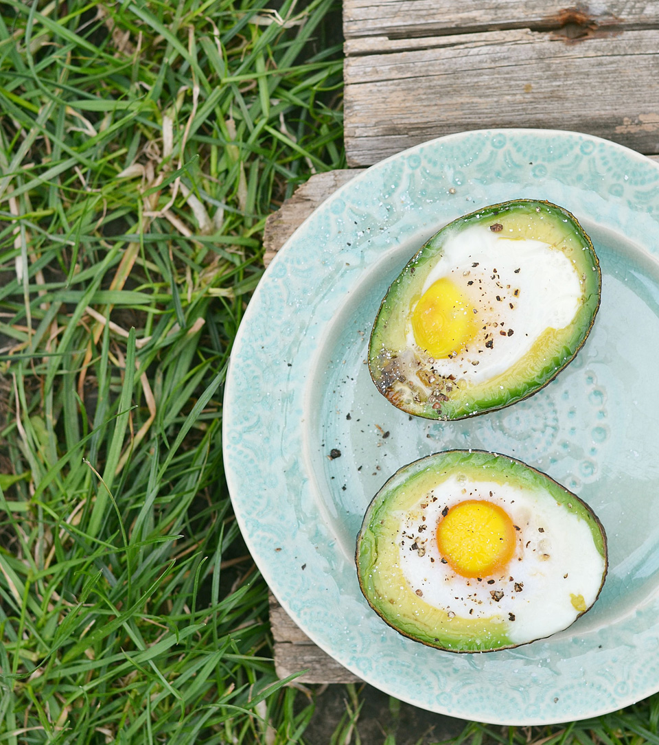 - Crack an egg into each avocado half. Try your best to crack the yolk in first, then let the egg whites spill in to fill up the rest.