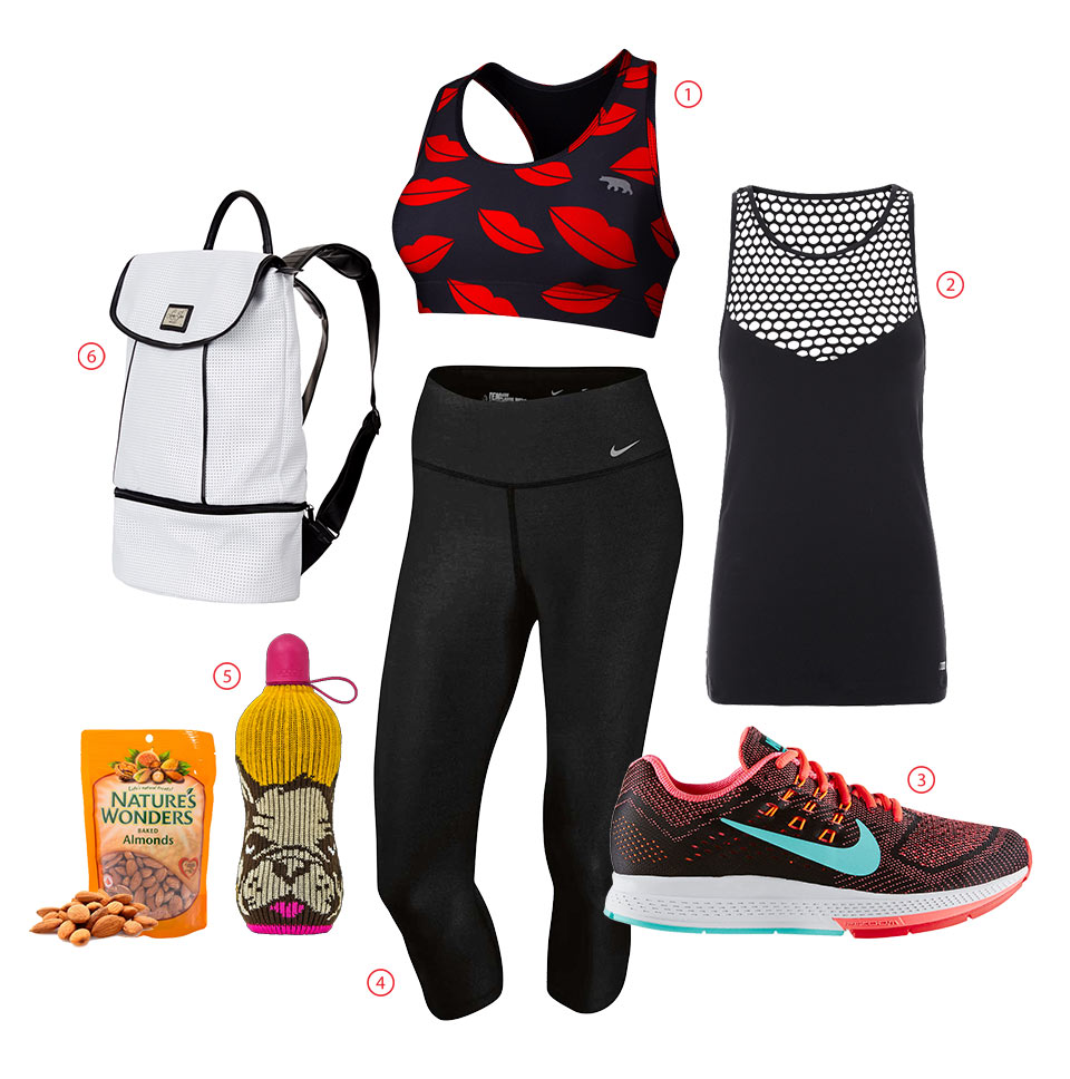 With a fashion forward mesh neckline, combine this slim-fit tank from Lorna Jane with a bold printed crop top from Running Bare for a unique look! Look your best with a pair of tights from Nike, and top it all off with a stylish gym bag and the super cool Nike Air Zoom Structure 18.