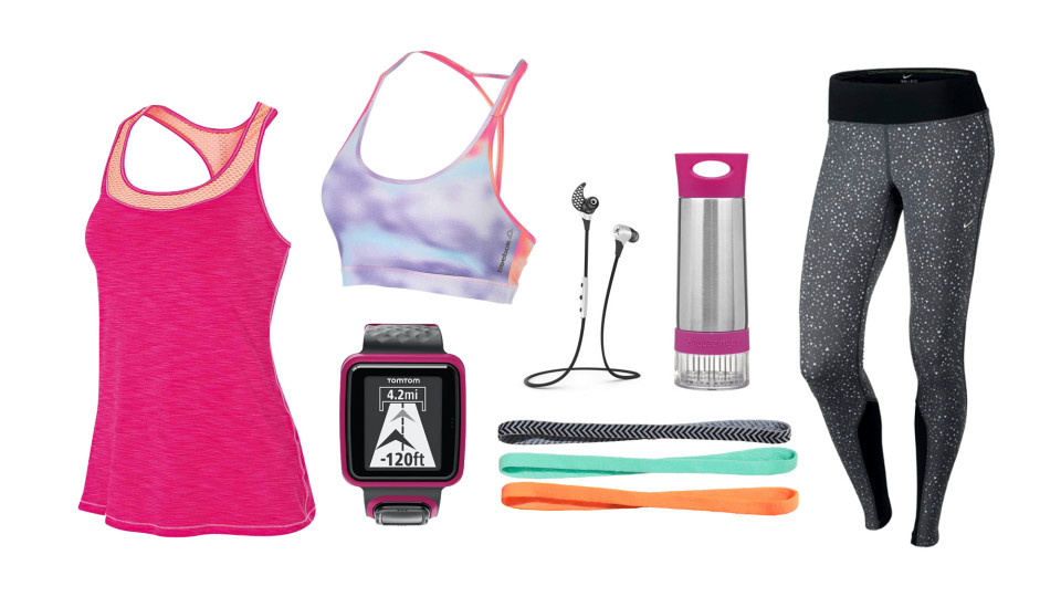 Try on the HKNB Essential Tank in Exuberant Pink by New Balance, and the Yoga Cloud Short Bra by Reebok. Keep yourself hydrated with the AquaZinger. Accesorise with a selection of elastic hairbands by H&M, and keep with the beat with a pair of Jaybird’s BlueBuds X. Finally, finish the outfit with a beautiful pair of Epic Lux printed running tights by Nike, and TomTom’s Runner GPS watch!