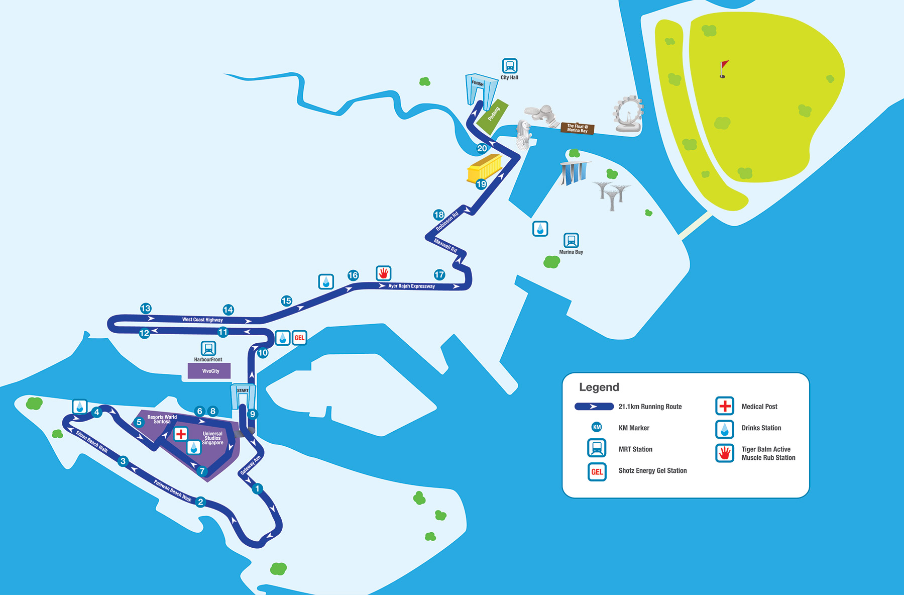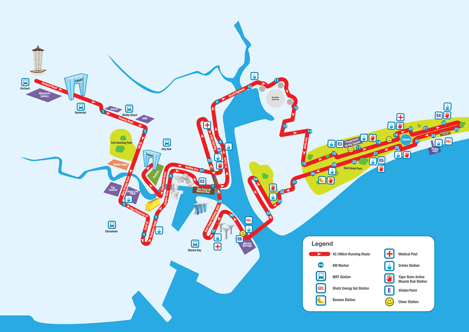 For the Half Marathon route, at about 18km point, runners will now get off the Marina Coastal Expressway (MCE) via the exit ramp leading to Maxwell Road. They will then make their way through the Central Business District via Robinson Road – Collyer Quay – Anderson Bridge and to finish at the Padang. The reason for this route revision is to reduce the 3km congestion which was traditionally a concern in previous years.