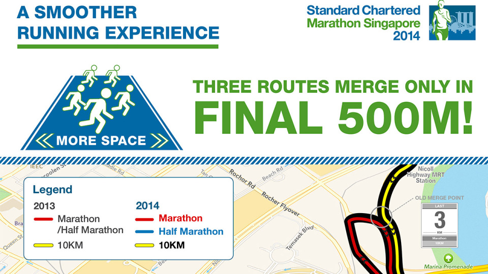 The event organiser Spectrum Worldwide has unveiled a significant change to the route which sets to reduce congestion at the merging point of various categories for this year’s Standard Chartered Marathon Singapore (SCMS) 2014. Those who have signed up for this iconic marathon, please read on to be aware of the changes to ensure a smoother and enjoyable run.