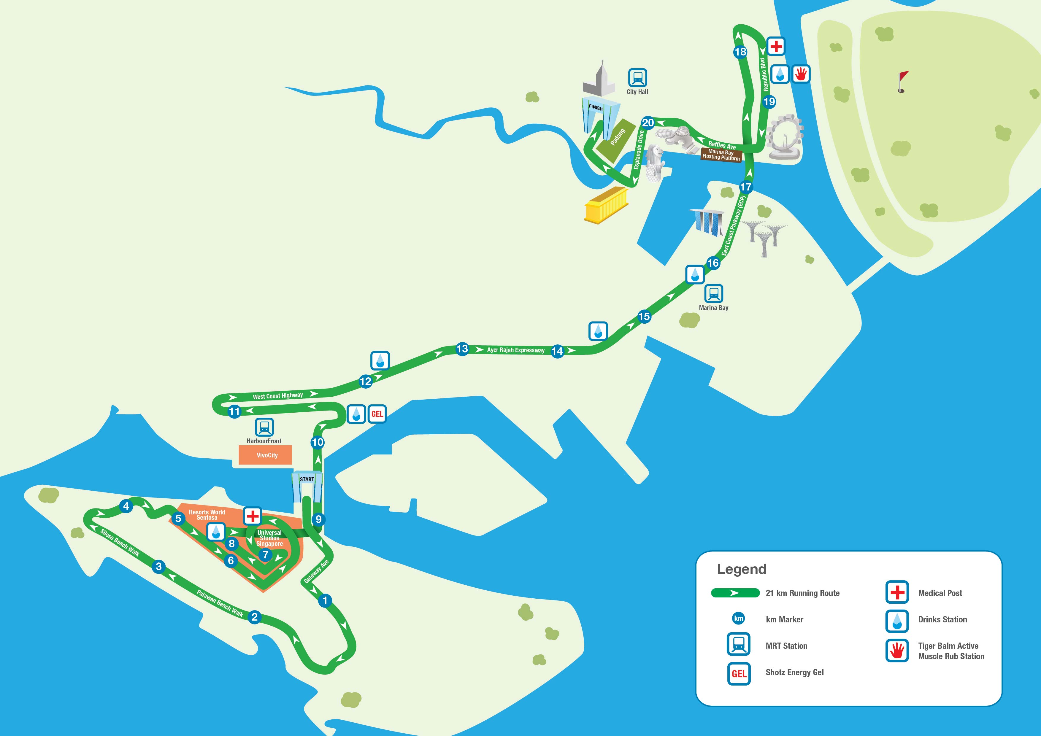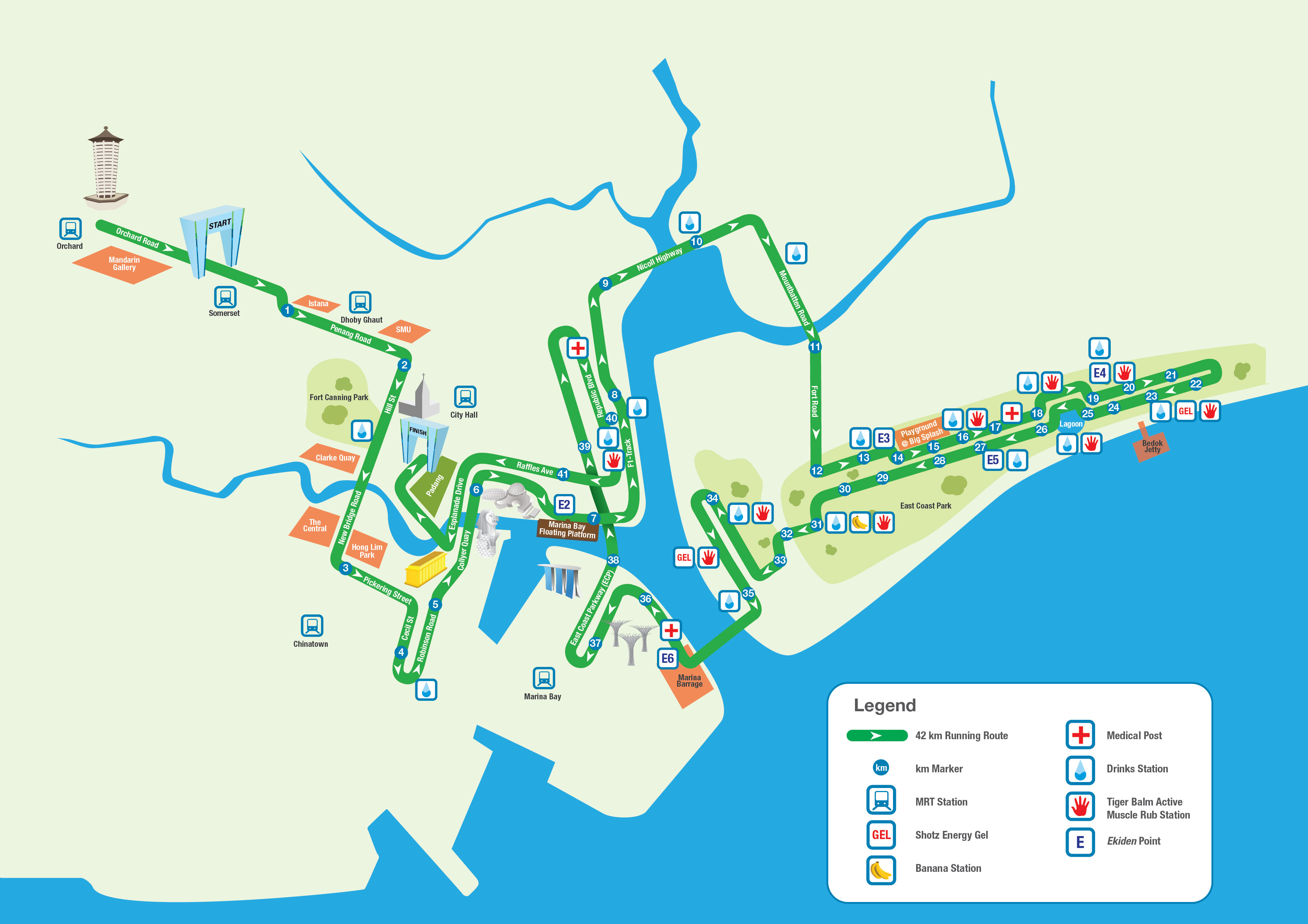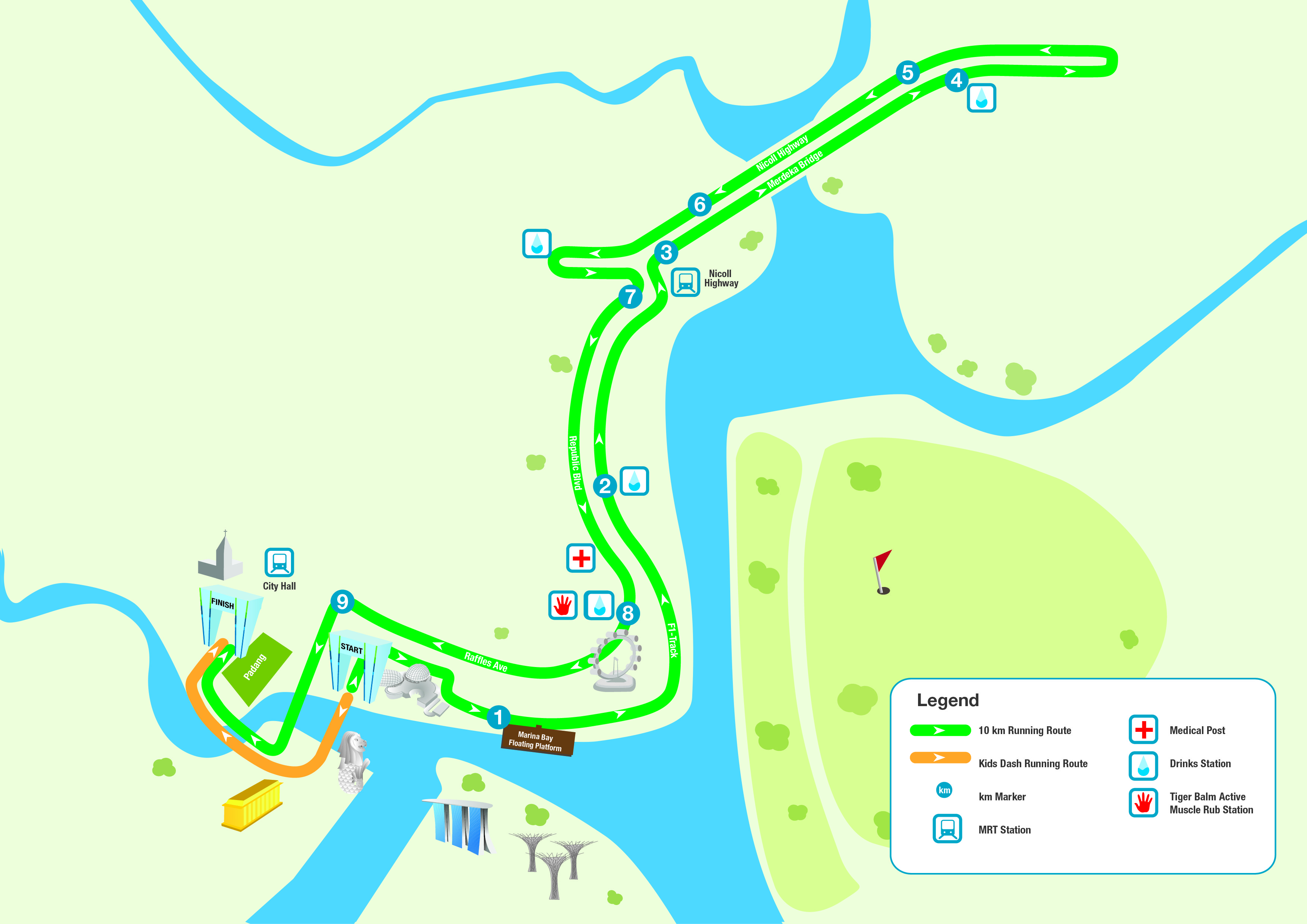 The Full Marathon route omits South Bridge Road and takes an earlier turn at Upper Pickering Road, with a wider path for runners to prevent congestion. The breathtaking views of Gardens by the Bay (South) will lift the spirits of the runners at the 37km mark.