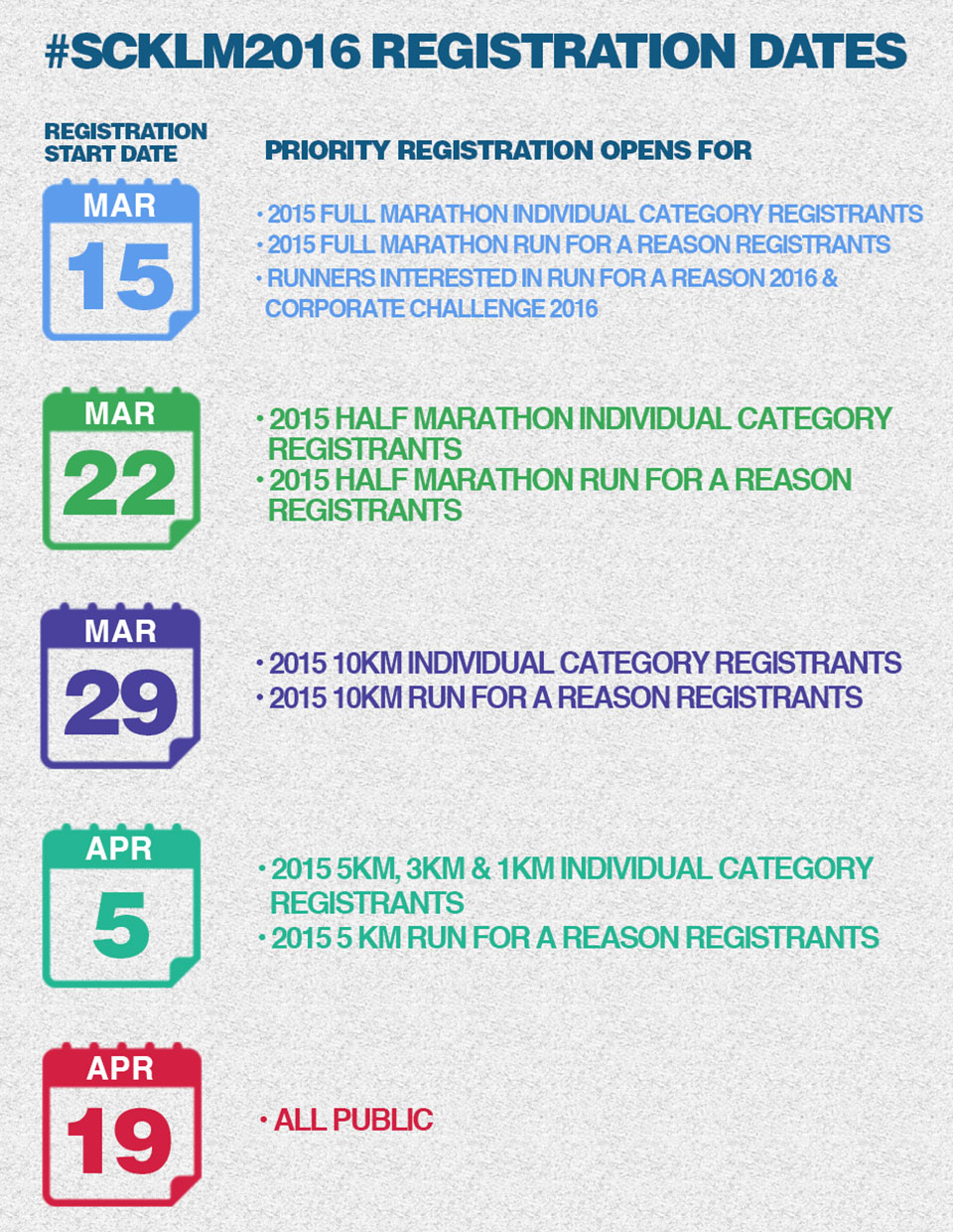 A new staggered registration system will be used to simplify the online sign-up process and reduce web-traffic congestion, allowing for a smoother registration experience. In addition, participants in SCKLM 2015 will be given priority to register for the 2016 event as last year’s race was cancelled due to the haze.