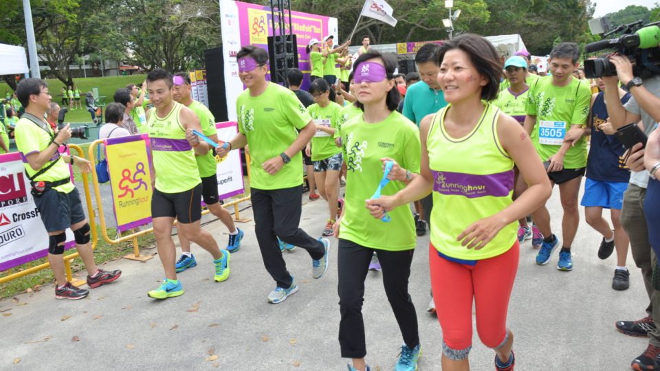 Guest-of-Honour and Minister of Education (Schools), Mr Ng Chee Meng attempting the Blindfold Run at Runninghour 2017, with Chairman of Runninghour, Mr John See Toh as his guide. Photo Credit: Runninghour