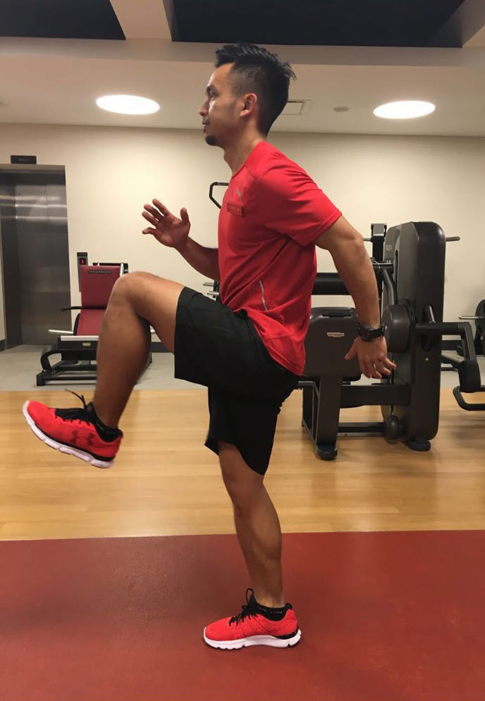 The hip flexors are one of the more neglected muscles during a warm-up. Keep core tight and legs straight. Lead with the heels.